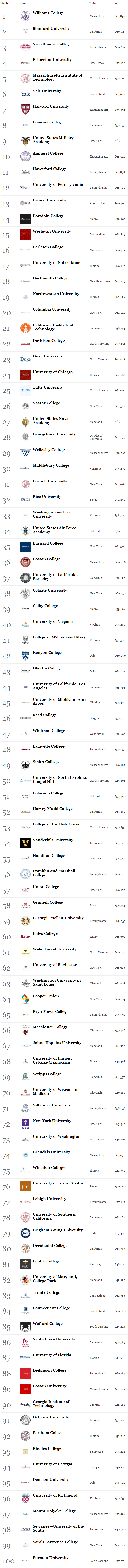 传统名校耶鲁大学及哈佛大学则未入前三,分别排名第6及第7位。据报道,该榜单的公布在美国引起热烈讨论,特别是关于大学人文与科研教育孰轻孰重的讨论,这次以人文为重的学院略胜一筹。