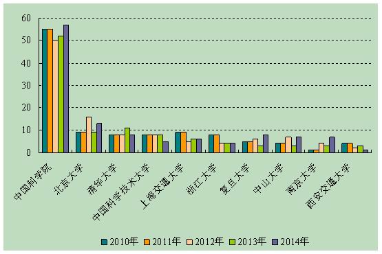 图2 2010~2014年国家杰出青年科学基金资助前十大机构分布,注:此次排名按照每个机构5年总资助人数进行排名