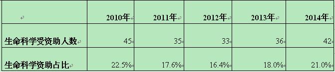 表1 2010~2014年国家杰出青年科学基金资助对象学科背景之生命科学占比,注:此次统计的生命科学内容包括交叉学科的内容。
