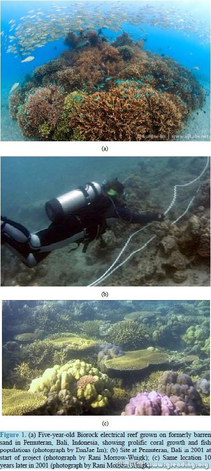 全球变暖、海平面上升、酸化、沉降、污染等做法使得海生态系统一直在退化,包括珊瑚礁、牡蛎礁和盐沼。常规修复方法只有在完美的条件下才能实现,但当水温升高或是水质恶化的时候,常规修复方法几乎完全没用。什么样的方法才能够大大增加海洋生物的生长、生存和抵抗环境压力,保护海岸、渔业和生物多样性等重要的海洋生态系统?答案是电,此自1976年开始应用于海洋生态系统的恢复,并取得了非常壮观的效果,如下图所示。