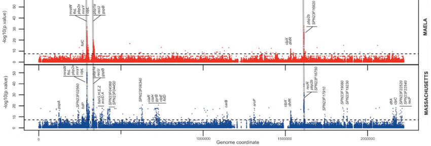 GWAS研究搜索整个基因组,查找单个DNA变化与生物体属性(如抗生素耐药性)有关的位点。要出现这种情况,就必须发生一个称为重组的遗传交换过程。这是两段DNA序列结合、交换遗传数据和重排单一变化组合的部位。由于重组(在人类中是很常见的)在细菌中很罕见,所以在这之前,研究人员无法定位构成一个基因的碱基序列中的单个变化。直到现在,才有可能定位一般区域,在这些区域中,变化发生在所谓的镶嵌基因(包含来自多个菌株的遗传学数据)中。