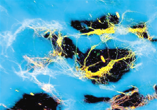 神经元(黄绿色)依附在支架(蓝色)上的共聚焦显微镜图像