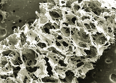 扫描电子显微镜拍摄的丝蛋白支架的海绵状多孔结构