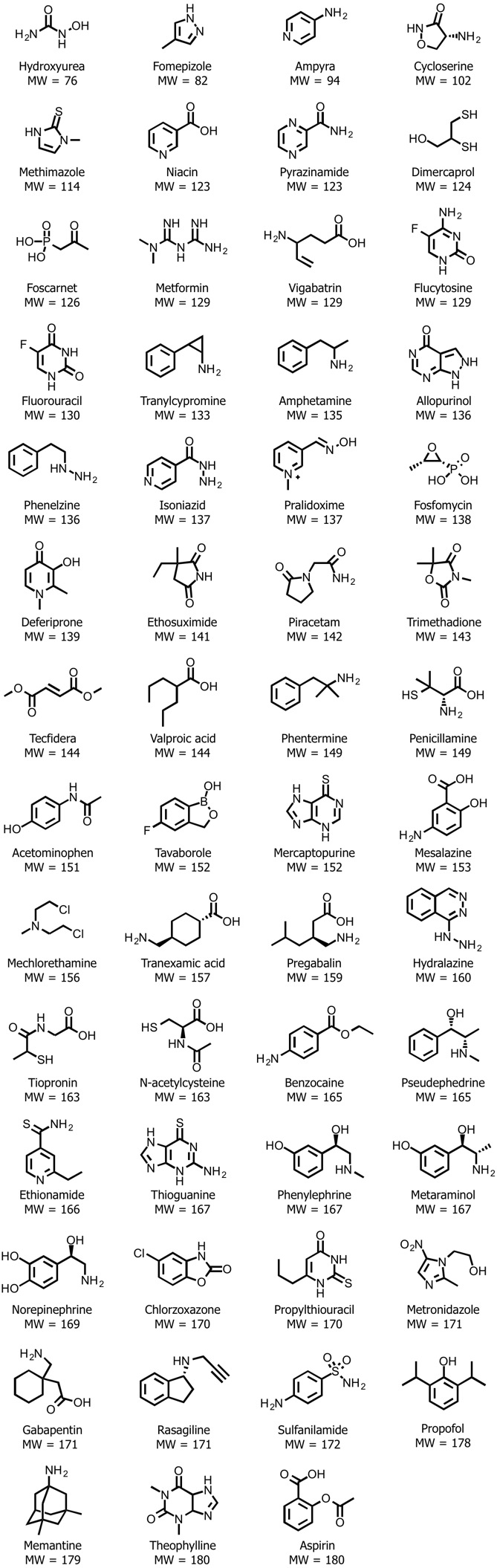首先这些分子或者有反应中心可以不可逆与蛋白质结合,或者有所谓的核弹头(warhead)如磷酸和羧酸。磷酸和羧酸如果位置恰当比其它基团能提供多得多的结合自由能。这两个因素使这些药物虽然很小、很简单但可以有超出一般的结合能和活性。其次,不少药物是内源性物质的类似物,尤其是芳香乙胺衍生物和多巴胺、5羟色胺十分类似。而这些神经递质受体通过进化可以和非常简单的分子以高强度结合,所以这些分子虽然小,但属于皇亲国戚,仍然对某些受体有很高活性。第三,除了上述两种较特殊情况,一般分子量这样小的分子活性确实要低一些,但问题是这些分子和其它的蛋白结合也同样或者更低,所以选择性不一定差。只要水溶性好(大部分水溶性极好)增加剂量就可以解决疗效问题。除了个别药物外我估计大部分在这个单子里的药物都需较高剂量(>1克)。最后,有些药物是短期急性用药,如解毒药。危机时刻虽然有点副作用问题也不大。