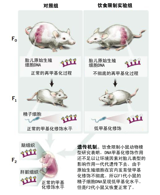同样的,如果用低蛋白饮食喂养怀孕的大鼠,那么连续两代子代大鼠在成年之后都会患上糖尿病。虽然有这么多研究都表明,在宫内时受到的各种环境因素影响都会给子代成年之后,以及这些子代的后代带来身体健康方面的影响,但是这种多代遗传的机制还是没搞清楚。