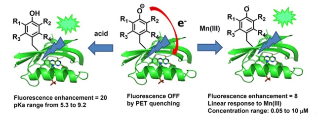 中国科学院生物物理研究所王江云研究组利用基因密码子扩展技术,实现了在活细胞中编码一系列卤代酪氨酸(3-氯代酪氨酸(ClY)、3,5-二氯代酪氨酸(Cl2Y)、3,5-二氟代酪氨酸(F2Y)、2,3,5-三氟代酪氨酸(F3Y)、2,3,5,6-四氟代酪氨酸(F4Y)),在荧光蛋白中实现了大分子中的光致电子转移现象,基于光致电子转移原理发展了对pH及Mn(III)敏感的荧光传感器。