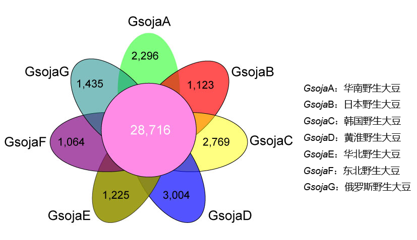 项目牵头人、中国农科院作科所邱丽娟研究员认为,通过十余年大豆核心种质构建及遗传多样性研究发现,对于高度自交的作物--大豆,一个基因组无法准确代表其物种基因的整体情况,泛基因组能够有效解决这样的问题。该研究选择了7份有代表性的野生大豆进行从头测序和独立组装,构建野生大豆泛基因组,通过基因集比较分析,占48.6%的核心基因反应了野生大豆的生物学特点;51.4%的非核心基因,在生物和非生物逆境相关途径上富集,反应了野生大豆的广泛适应性。