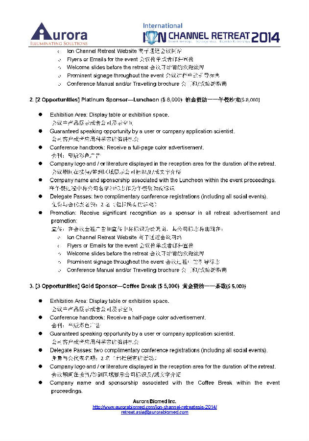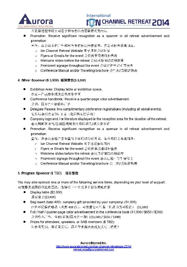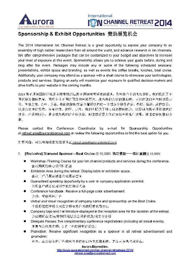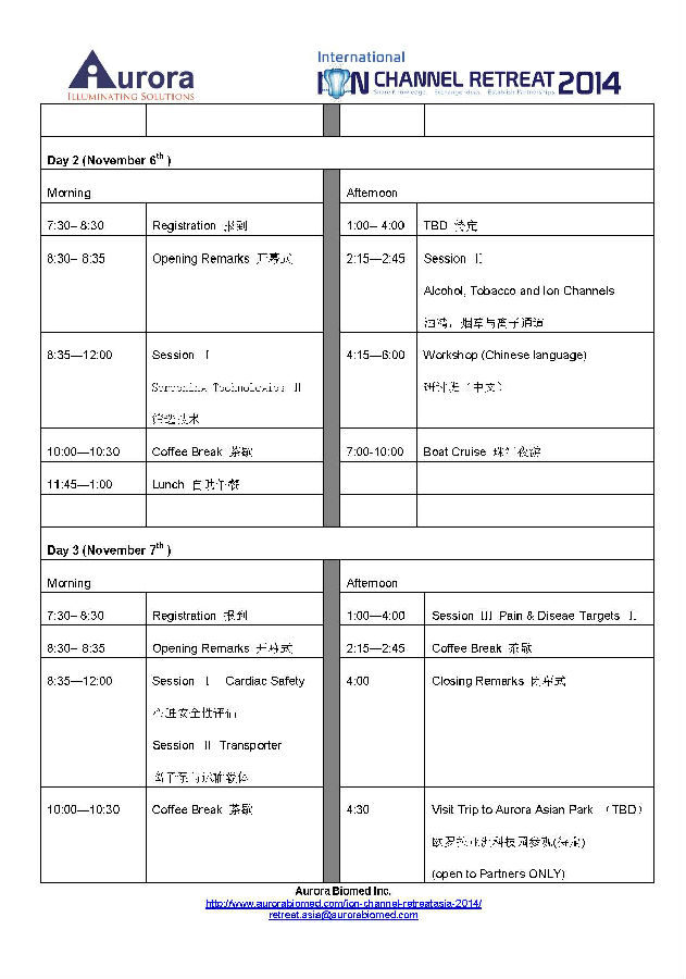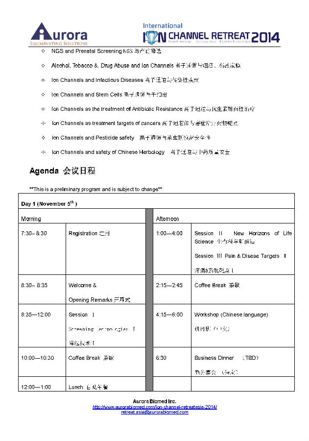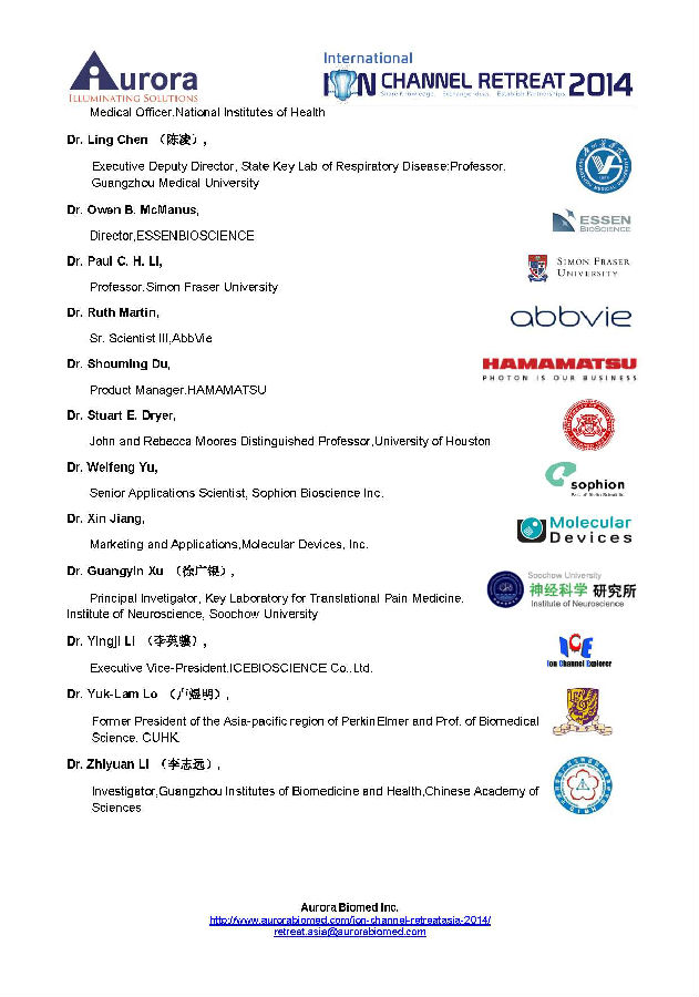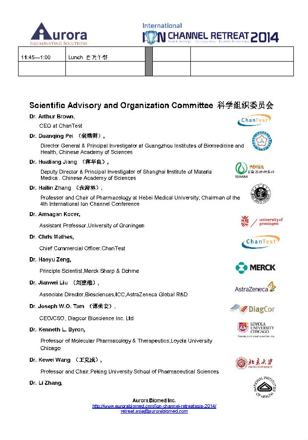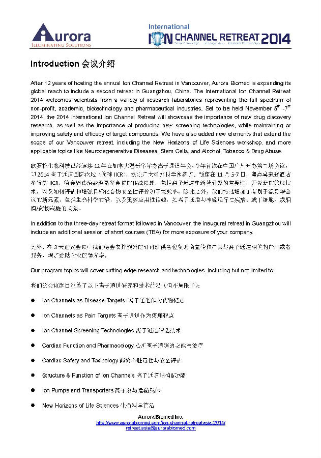 欧罗拉生物科技已经连续12年在加拿大温哥华举办离子通道年会,今年首次在中国广州开办第二场会议,即2014离子通道国际论坛(简称IICR),欢迎广大研究科学家参加。预定在11月5-7日,粤海喜来登酒店举行的IICR,将会继续沿袭温哥华会议的传统议题,包括离子通道在新药研发的重要性,开发新的筛选技术,以及如何评估和增强目标化合物安全性评价和开发效率。除此之外,我们特地增加了有别于温哥华会议的新元素,包括生命科学前沿,以及更多应用性话题,如离子通道与神经退行性疾病、或干细胞、或烟酒/药物成瘾的关系。