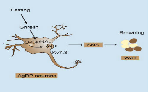 研究人员发现,在小鼠大脑中活化上述棕色化过程,能够帮助高脂饮食的小鼠避免肥胖。他们分析了下丘脑AgRP神经元中发生的分子改变,钾离子通道添加O-GlcNAc的过程(糖基化),是大脑控制脂肪燃烧的开关。