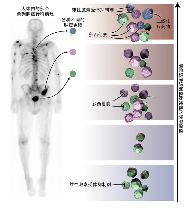 图1:对肿瘤转移克隆进行连续检测能够指导体内存在CRPC细胞(不依赖雄性激素的肿瘤细胞)前列腺癌患者的临床治疗。上图形象的展示了前列腺癌转移患者体内发生的具体情况,如图所示,有多个转移灶肿瘤细胞克隆都会进入到人体的循环系统当中。随着疾病的进展,慢慢发展到致死性的CRPC期,这些肿瘤克隆也都是导致患者产生耐药性的根本原因。对这些肿瘤克隆进行遗传学分析能够指导临床医生在恰当的时间选择使用最合适的药物,包括abiraterone和enzalutamide等抗雄性激素药物,泼尼松(prednisone)、化疗药物多西他赛,以及多西他赛与enzalutamide联用或二线化疗药物cabazitaxel等。
