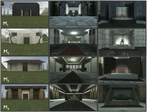 研究小组构建的虚拟公园对于区分被试者用于确定自己相对这些物体的位置时究竟使用的是哪一种系统至关重要。公园的四座博物馆以四叶草的样式环绕中央广场分布,但只能从南部进入这个公园。每一座博物馆都有一扇单独的门,所有的都朝向广场中央。每一座博物馆都非常独特但布局相同:一间单独的房间里包含8个独特的物体,每面墙上有两个物体。这些物体都被放在壁龛里,因此被试者只能从正面看到它们。