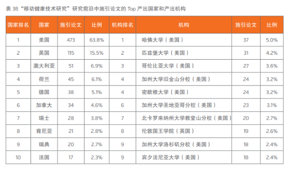 论文数据显示(表36),目前,移动健康技术方面的研究主要集中在美国、英国、澳大利亚、肯尼亚和新西兰等国家,以上国家关于移动健康技术的核心论文均有2 篇以上,其中美国的核心论文最多,占据14 篇,达到70%。