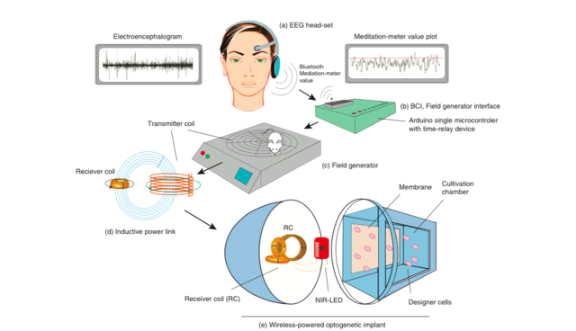 意念控制基因表达的示意图:(a)为测试者在头上佩戴的电极装置,可以用来接受脑电波,并对特定精神状态的脑电波进行加工并通过蓝牙传导到(b)BCI-场频信号发生器接口, 来控制(c)场频信号发生器的开关。然后通过(d)这个感应电源连接装置中的接收线圈控制(e)中NIR-LED灯的开关。(e)中另一个关键结构是细胞培养室(右侧),含有光遗传通路的细胞悬浮培养在小室中,通过半透膜将SEAP扩散到小鼠的血液中。这些细胞在接收到光信号后,即可以开启目的基因的表达。