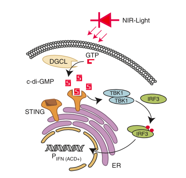 光控基因表达是合成生物学和光遗传学的一项前沿技术。研究人员设计了一个对近红外(NIR)光谱范围敏感的光遗传装置(指经过改造,转入了可以被光照激活的基因的细胞)。NIR着很高的组织穿透性,而且其光毒性可以忽略不计。整个光遗传装置的原理大致是这样的:当有近红外光照射时,细胞中的DGCL蛋白可以捕获该光线而使自身被激活,并将三磷酸鸟苷(GTP)转化生成第二信使环二鸟苷酸(c-di-GMP)。作为感受器的STING蛋白可以结合环二鸟苷酸而被激活,导致TBK1蛋白对IRF3进行磷酸化修饰,并使之向细胞核内进行转移。最终使被转入的基因开始表达分泌型碱性磷酸酶(SEAP)(一种人体内的糖蛋白)。