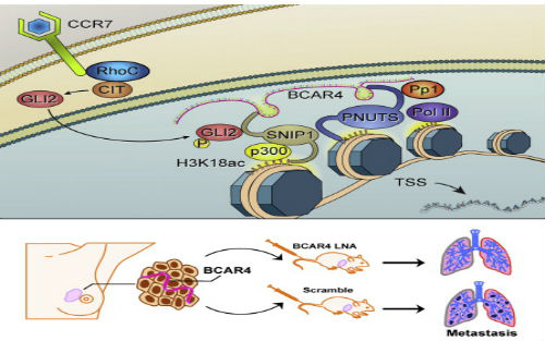 “治疗性传送靶向BCAR4的LNAs强有力地抑制了乳腺癌转移。我们证实了BCAR4和hedgehog信号通路之间的联系,其可以作为采用新的方法来治疗侵袭性乳腺癌的一条可行的途经。”