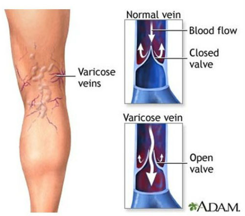 正常人的静脉瓣可以帮助静脉完成下肢血液的回流(上图),而静脉曲张的病人主要表现为静脉瓣的功能障碍(下图),在这种情况下增加局部血流会加重静脉回流的负担。