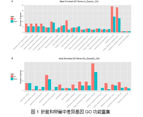4. 功能注释:通过基因GO富集分析显示,肝脏中的差异基因主要涉及的功能有脂肪酸合成和代谢、脂肪合成和代谢,卵巢中的差异基因主要与应激反应相关(图1);