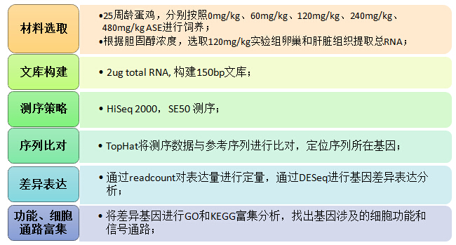 河南农业大学畜牧兽医学院与诺禾致源合作,利用转录组DGE(数字基因表达谱)技术对苜蓿皂甙饲养条件下的蛋鸡肝脏和卵巢转录组进行分析,初步揭示了苜蓿皂甙影响胆固醇代谢的分子机制。该研究成果2014年9月6日在线发表于国际著名学术期刊《PLoS ONE》(IF:3.534)