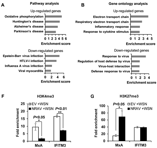 作者进一步研究NRAV促进IAV复制的机制,在病毒感染的细胞中过表达NRAV,通过全基因组表达谱芯片检测基因表达改变。GO分析显示很多差异表达基因与病原体感染和病毒复制有关,并且众多干扰素刺激基因的基因表达发生显著变化。