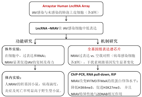 该研究揭示了lncRNA在抗病毒天然免疫反应中的重要调控功能。在病毒感染的细胞中,长链非编码RNA-NRAV表达水平显著降低。体内外实验表明,NRAV能够显著促进IAV的复制,作为负调控因子影响抗病毒天然免疫应答。该研究确定了一个新的宿主抗病毒反应lncRNA,对了解病毒与宿主的相互作用起到促进作用,对于揭示流感等急性感染病毒的致病机理具有重要的科学意义,为新型抗病毒药物的研制提供了药物靶点。