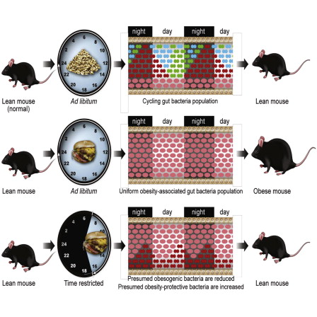 在第二篇文章中,科学家们探讨了不同进食模式对肠道菌的影响。肠道菌组成了肠道的微生物组,而微生物组能够影响机体的代谢过程。