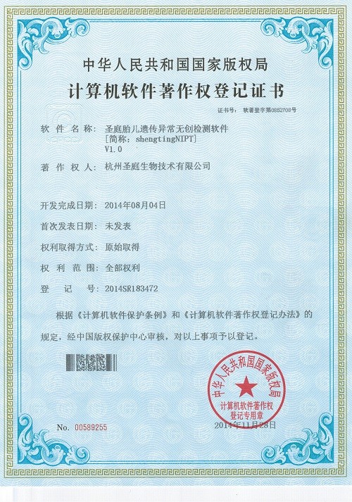 圣庭胎儿遗传异常无创检测软件取得软件著作权登记证书