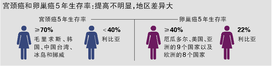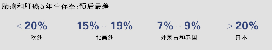 ●预后较差的肝癌和肺癌仍是致死率最高的癌症,5年生存率在欧洲低于20%,在北美洲为15%~19%,而在外蒙古和泰国仅为7%~9%。
