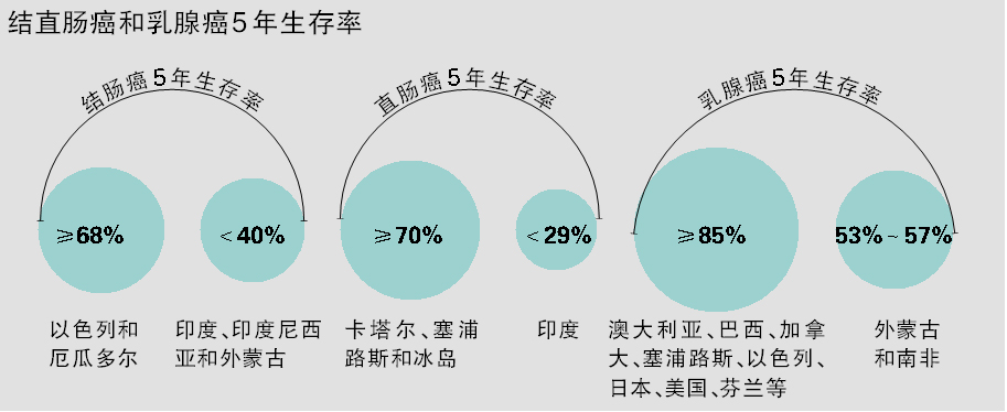 ●结直肠癌和乳腺癌的生存率在发达国家稳步提高,很多国家以上两癌的5年生存率分别达到60%和85%以上。