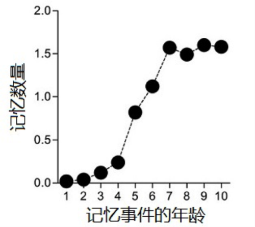 人类10岁前的自传体记忆分布情况。受试者3岁以前发生的事情很少被记住。