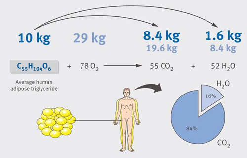 从质量上看,消耗掉的脂肪主要以二氧化碳的形式呼出。图片来自原文