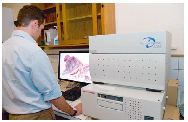 2011年我们的研究实验室开始使用滨松NanoZoomer2.0-RS数字切片扫描仪。它可以以高分辨率(最大×40)快速自动地将多达6个玻璃切片扫描为数字切片。感谢INSERM(癌症计划2009-2013)让我们有机会使用这个设备。