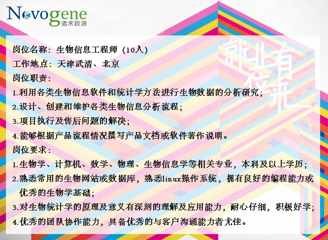 闲话少说,邮箱HR@novogene.com在这里,简历砸过来,你懂的!我走了,请你随便看看下面的内容,然后就奔跑吧兄弟,我等着你来!!