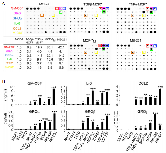 宋尔卫教授课题组通过乳腺癌细胞株和人原代巨噬细胞共培养模型,发现发生EMT的乳腺癌细胞(间充质样肿瘤细胞)比未发生EMT的乳腺癌细胞(上皮样肿瘤细胞)更具有激活巨噬细胞成为TAMs的能力。作者应用RayBio Human Cytokine Antibody Array检测发生EMT和未发生EMT的乳腺癌细胞培养上清液,结果显示GM-CSF,IL-8,CCL2,GRO,GRO和GRO在发生EMT的乳腺癌细胞样本中表达水平显著升高,进一步验证发现只有GM-CSF在乳酸的协同作用下能够激活巨噬细胞转化为TAMs。