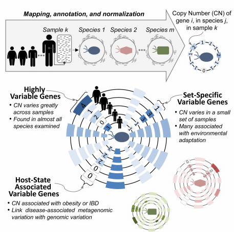 Borenstein等人通过计算分析精确定位了每个序列的菌种来源,发现在一百多人的微生物组中,有几十个菌种的五千多个基因存在着显著的拷贝数变化。这样的基因出现在他们所分析的每个菌种中,有些菌种近四分之一的基因都存在拷贝数变异。