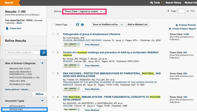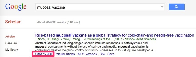 利用 google 的检索语法(网上可搜索),设置最合理的检索词后,展开结果。例如使用“mucosal vaccine”进行检索,得到 204,000 项结果。每个检索结果下面有“被应用次数 (cited by)”一项。一般说来,被引用超过 100 次的,当属质量上乘的文献了(当然如果碰见黄禹锡那样情况就当属意外了)。