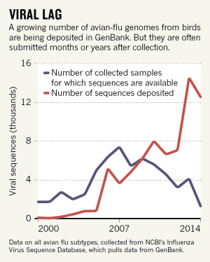 Nature新闻团队分析了在过去15年呈送至GenBank的所有禽流感亚型的测序基因组数量。结果显示全球的整体遗传检测仍十分不利,不够迅捷。大多数病毒都是在收集数月或数年后进行测序。