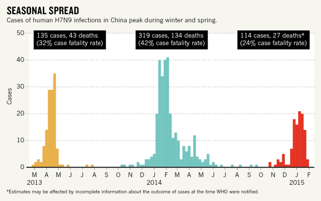 H7N9首先是在2013年3月底在上海及周边地区被发现,当年的4月病例开始飙升。在确定活禽市场是疾病向人类传播的主要途径后初期的疫情很快得到了控制。尽管人们希望病毒能够逐渐消失,但这一期望最终破灭,在那年的冬天H7N9再度归来,向南方传播造成了第二波大规模的人类感染。2014年的夏天暂时没有出现新的病例,确证了它的季节性模式。而在去年年底感染又再度上升,这第三波感染至今仍在持续之中。
