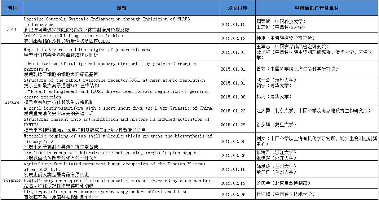 在生物学领域,三大期刊(Cell、Nature和Science)及其子刊,简称CNS,倍受中国研究人员推崇,他们希望凭借CNS在学术界的威望将中国尖端、前沿的研究成果向全世界传达。这些研究动态代表了中国科研机构的最高水平。本文盘点了2015年1-3月中国机构及科研人员在CNS上的发文情况。