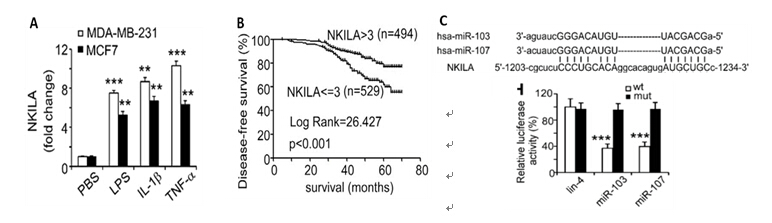 图C. 图示miR-103/-107与NKILA的结合位点,荧光素酶报告基因实验确认miR-103/-107调控NKILA表达水平。