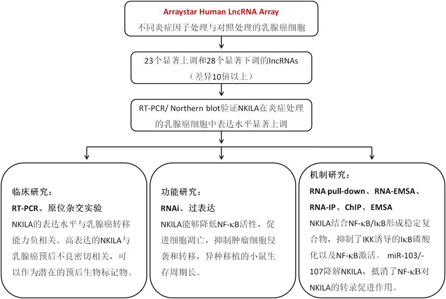 中山大学孙逸仙纪念医院乳腺肿瘤中心宋尔卫教授主要从事乳腺癌的生物学特性及治疗学基础研究,在非编码RNA调控肿瘤侵袭转移及靶向导入小分子RNA抑制肿瘤转移的研究方面有杰出工作。近期,宋尔卫教授课题组利用Arraystar Human LncRNA芯片发现了能抑制乳腺癌肿瘤转移的新lncRNA分子——NKILA。NKILA能够与经典的NF-kB信号通路相互作用,通过结合NF-kB/IkB抑制了IKK诱导的IkB磷酸化,使得NF-kB信号通路失活,从而抑制乳腺癌肿瘤转移。该研究成果刊登在国际顶级期刊Cancer Cell(影响因子23.893)。(芯片实验由康成提供技术服务)