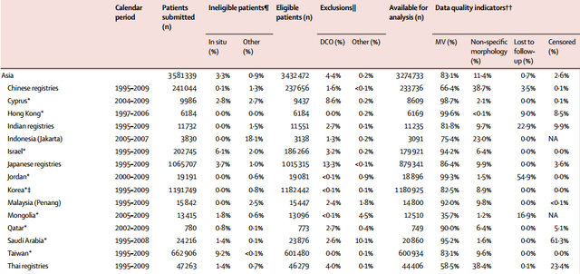该研究中,共有来自 67 个国家的 279 个以人口为基础的癌症患者人群入组,受试者均于 1995-2009 年期间确诊,随访至 2009 年 12 月 31 日之后,共纳入成年病例 2570 万(年龄 15-99 岁),儿童病例 7.5 万名(年龄 0-14 岁)。监测癌症类型如下:成人胃癌、结肠癌、直肠癌、肝癌、肺癌、乳腺癌(女性)、宫颈癌、卵巢癌和前列腺癌,以及成人和儿童白血病。
