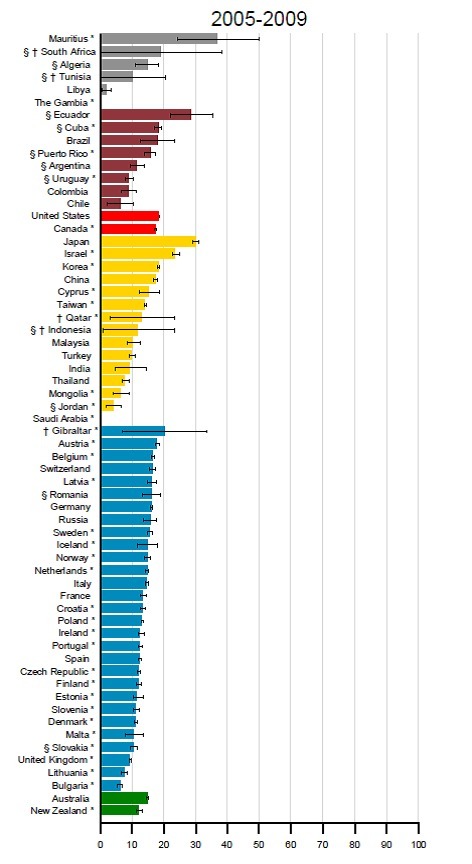 日本和韩国在 2005-2009 年胃癌的 5 年生存率较其他国家高(为 54%-58%),而这两个国家成人白血病的 5 年生存率低于其它大多数国家 (18%-23%)。胃癌 5 年生存率达到 30%-39% 的国家是:奥地利、比利时、中国、德国、冰岛、意大利、葡萄牙、瑞士、台湾地区。