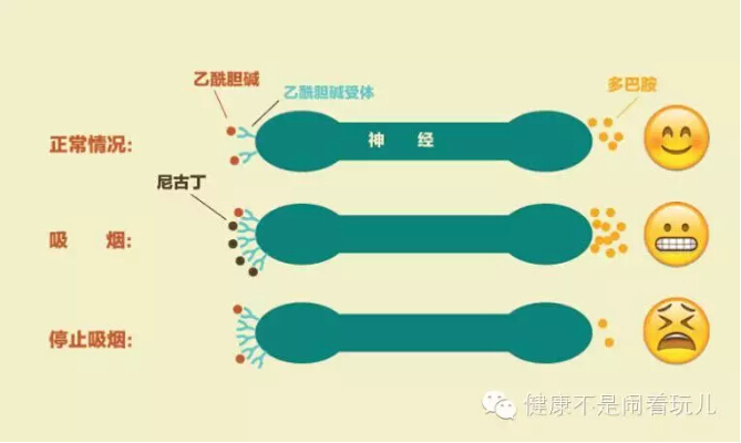 成 瘾的机制是这样的,尼古丁会结合到烟碱型乙酰胆碱受体上,强度比我们身体自己的乙酰胆碱更好,因此等同于增加了神经递质的量,脑奖励中心的神经元分泌的多 巴胺增加,从而产生幸福感和放松感。由于这个结合非常极强,半减期长达2个小时,而乙酰胆碱的半减期只有1分钟,所以大脑为了补偿,吸烟者的神经细胞上乙 酰胆碱的受体比一般人多很多,大部分被尼古丁相结合,余下的和乙酰胆碱结合的才和普通人差不多。人在戒烟的时候,那些受体得不到结合,多巴胺会下降,从而 产生各种不适的现象[9]。