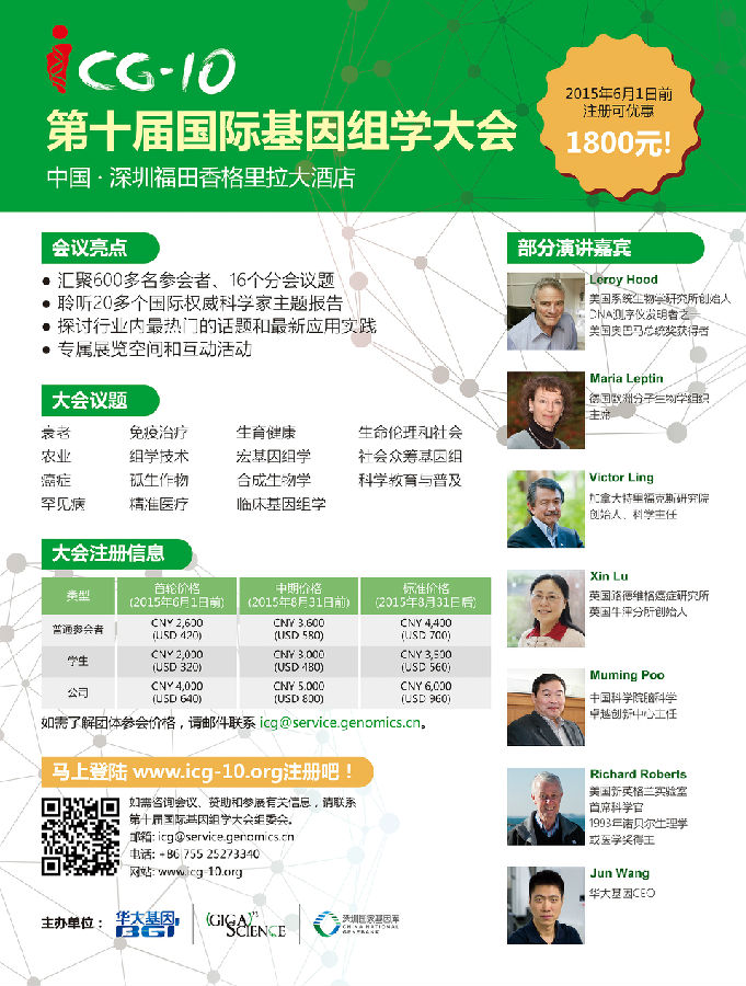 ICG-10的主题将涵盖临床基因组学、生殖健康、癌症、衰老、宏基因组学、孤生作物、合成生物学,以及生命伦理和社会(包括妇女和非政府组织发挥的作用)。ICG-10 将汇集最有影响力的知识领袖、最权威的科学家,覆盖最热门的话题和最贴近民生的应用成果。
