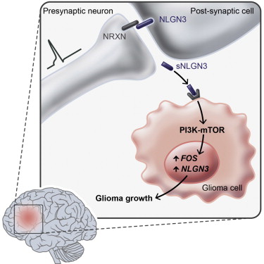 研究人员发现,在大脑皮层的神经元活性与肿瘤生长之间,蛋白neuroligin-3起到了关键性作用。虽然不同高级别胶质瘤有着不一样的分子和遗传学特征,但neuroligin-3对它们起到了类似的影响。