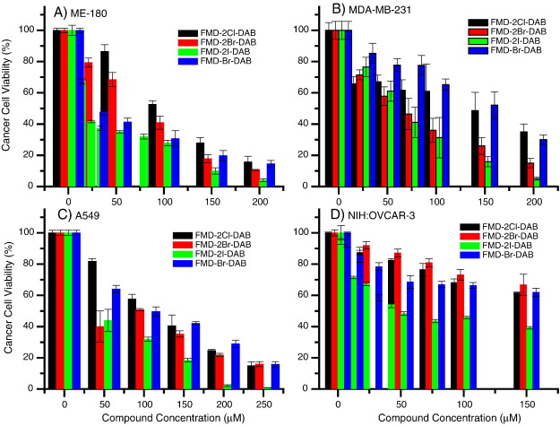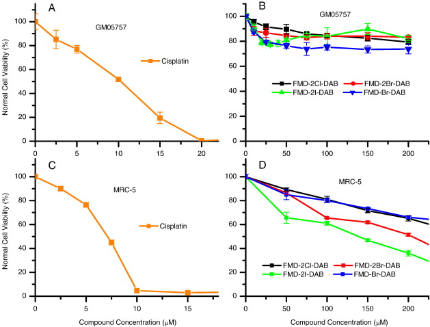 大学陆教授及其同事正是利用FMD技术发现这类分子的。FMD分子与乳腺癌、睾丸癌、肺癌、脑癌等癌症的治疗药物顺铂结构类似,却没有顺铂那样的毒性。体外对健康细胞毒性试验发现,顺铂对MRC-5和GM05757健康细胞系IC50分别为6 和10μM ,而FMD分子对MRC-5和GM05757健康细胞系IC50分别为150μM和≥200μM。