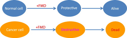 体外抗肿瘤细胞实验发现,FMD分子进入癌细胞,就发生强烈反应并生成活性基团,引发细胞“自杀”。FMD分子进入健康细胞,就会诱导生成GSH,保护细胞免受化学毒性侵害。更有趣的是癌细胞GSH水平是降低的。这些实验结果,在大量各种人类和老鼠细胞系均可重复。
