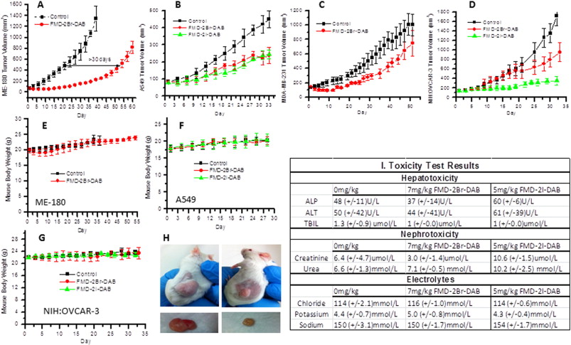 接下来进行多种肿瘤模型小鼠体内试验,发现FMD分子可以有效终止或延缓肿瘤生长。这一效果在顺铂抗性肿瘤中也可出现。有图有真相: