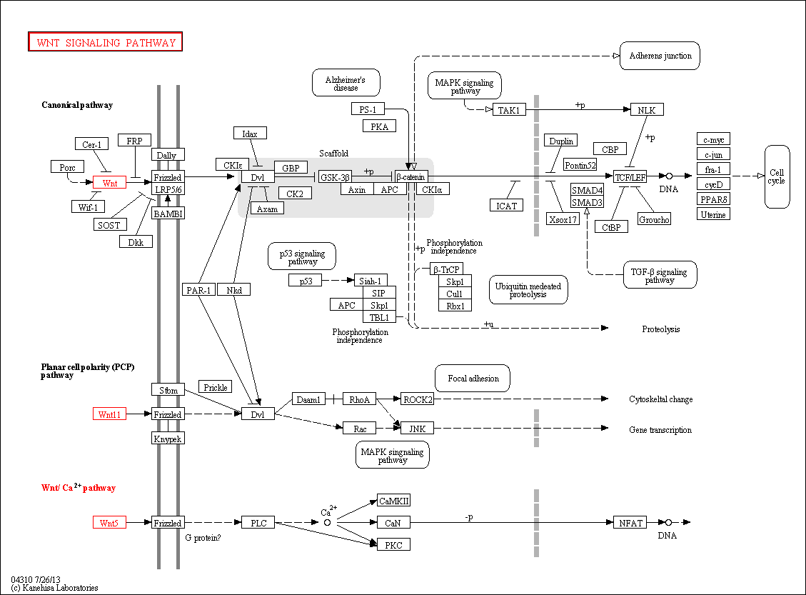 Wnt通路是细胞增殖分化的关键调控环节, 在胚胎发育和肿瘤发生中起着重要作用。Wnt途径参与了基因表达调节、 细胞迁移粘附、 细胞极化等过程, 同时还与其它信号通路存在交叉协同。