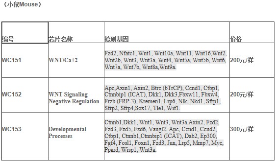 Wnt信号通路PCR芯片可以检测与Wnt介导的信号转导相关的基因表达谱。其中包括属于Frizzled-2信号通路的19个糖基化细胞外信号分子。也包括充当Wnt基因A(Frizzled-1信号通路成员)配体的细胞表面受体。还包括Wnt信号通路的调节基因和Wnt的竞争结合基因,细胞内分子基因和参与细胞调控与增殖的靶基因。该芯片还包含参与Wnt信号通路下游蛋白修饰的基因,包括激酶、磷酸化酶和参与泛素化的基因。